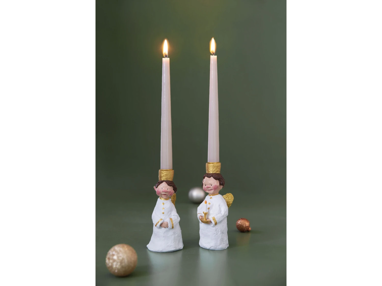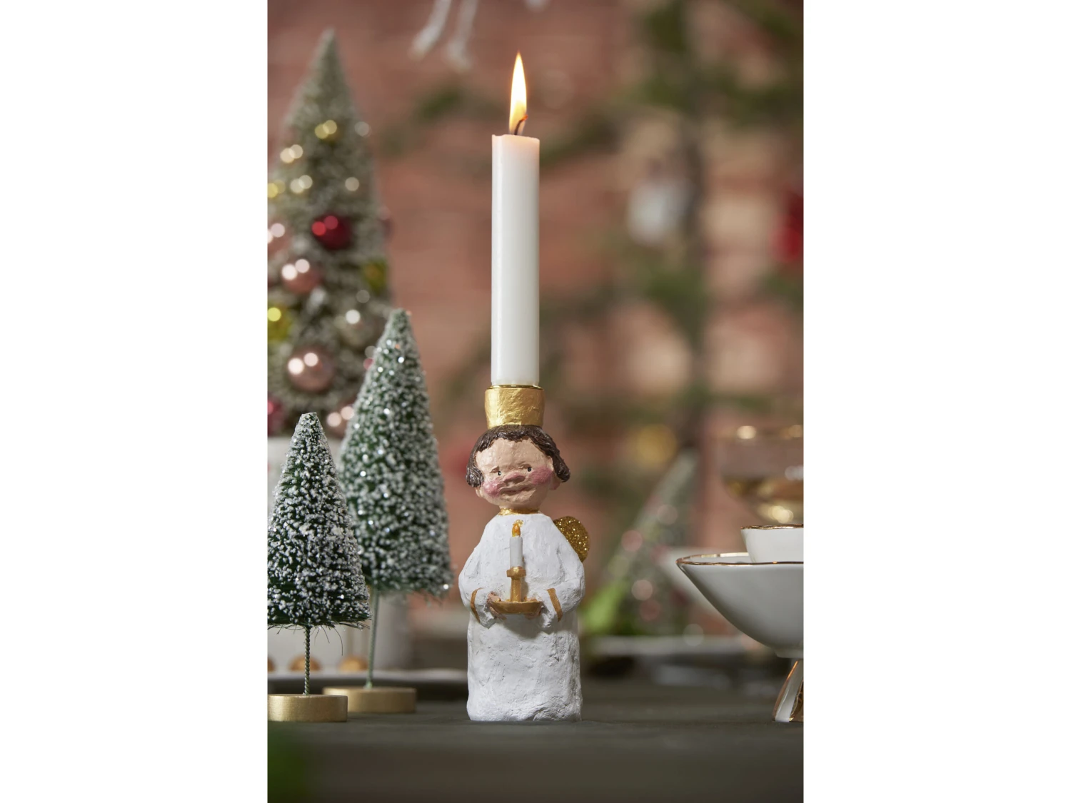 Der Engel Annie hat glitzernde goldene Flügel und hält eine Kerze in den Händen. Sie verbreitet Weihnachtsstimmung auf Ihrem Weihnachtstisch oder erleuchtet in der besinnlichen Weihnachtszeit die Fensterbank. Annie ist ein Kerzenleuchter, der für normale Kerzen passt. 17 cm hoch.