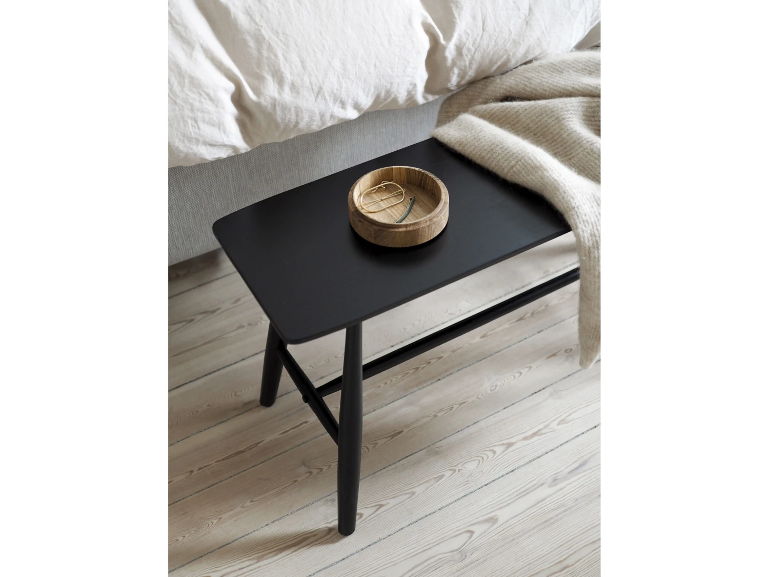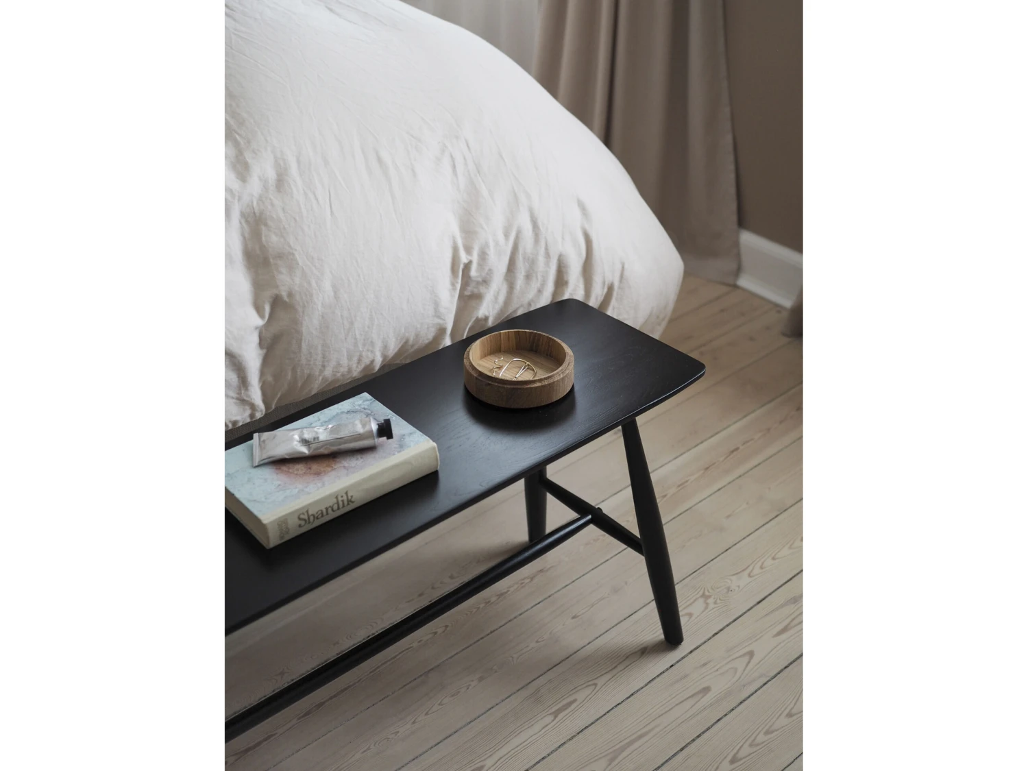 Bank aus schwarzlackiertem Eichenholz. Das schlichte, stilvolle Design passt perfekt zu einer skandinavischen Einrichtung mit entspannter Atmosphäre. Die Bank ist aus wunderhübschem Eichenholz hergestellt und sieht in jedem Zimmer der Wohnung toll aus. Für die Verwendung im Innenbereich. Max. Gewicht 120 kg.