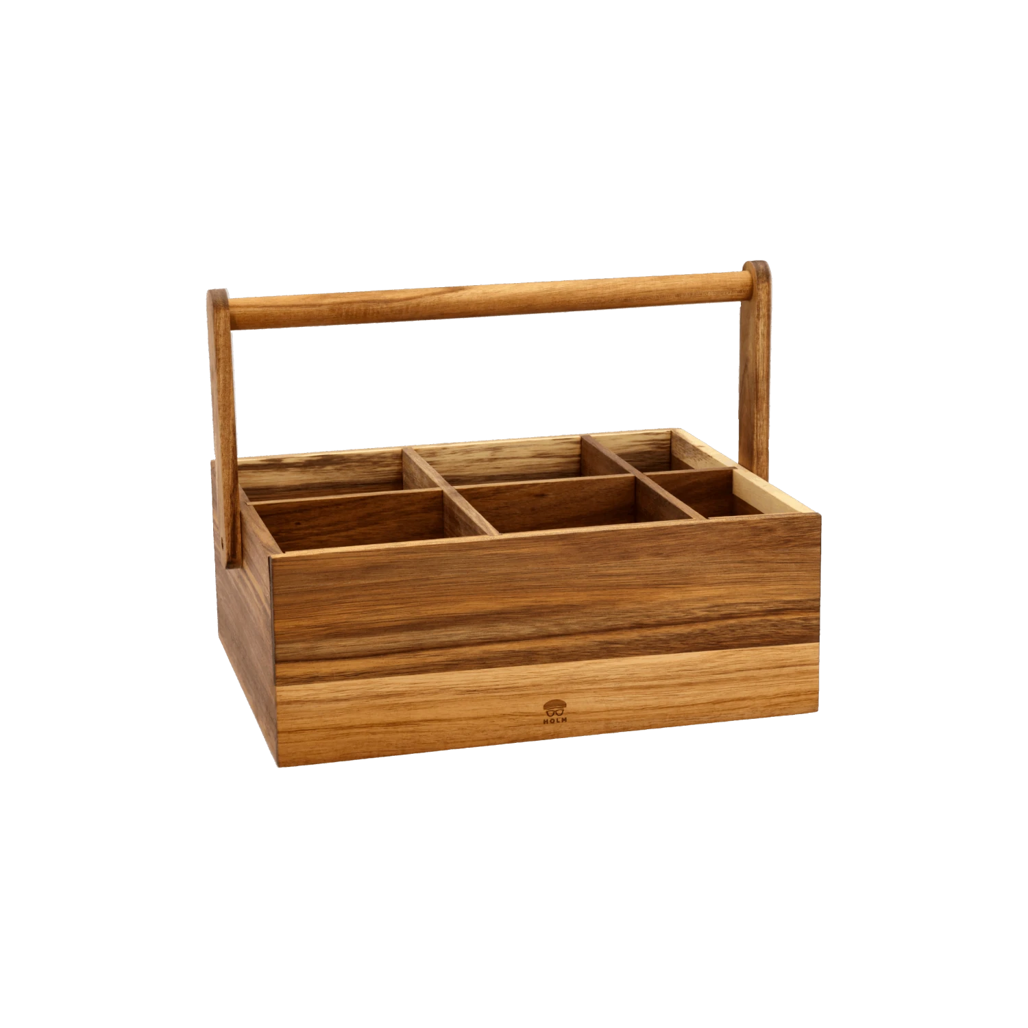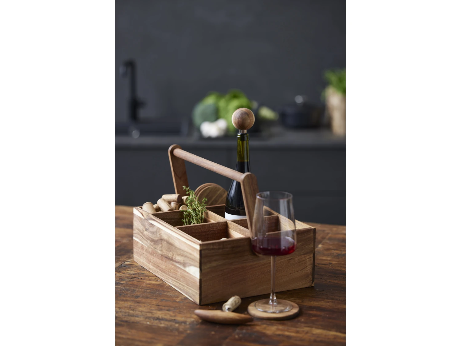 Große Multikiste aus geöltem Akazienholz mit Platz für Flaschen und Zubehör. Die Kiste hat einen stabilen Griff, vier große Fächer für Flaschen und zwei kleinere Fächer zur Aufbewahrung von z.B. Korkenzieher, Weinverschluss und Glasuntersetzern. Die Kiste ist Ihr idealer Helfer, wenn Sie für sich und Ihre Gäste Ihre Lieblingsweine aus dem Weinkühlschrank oder aus dem Keller holen. 37 x 27 x 28 cm.