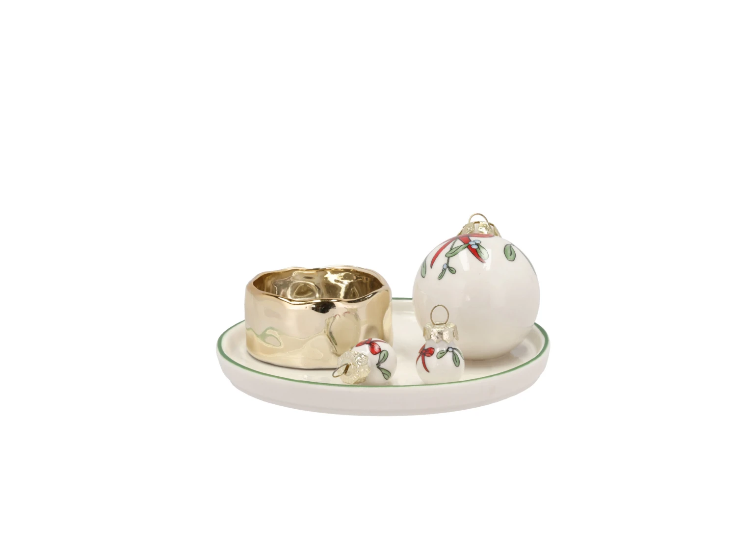 Feine handbemalte Weihnachtskugeln mit roten Schleifen und Mistelzweigen schmücken diese Porzellanschale mit Goldkante, die perfekt als hübscher Kerzenhalter für die Kalenderkerze verwendet werden kann. Es ist einfach so gemütlich mit Kerzenschein in der dunklen Zeit. Der Durchmesser der Schale beträgt 13,5 cm.