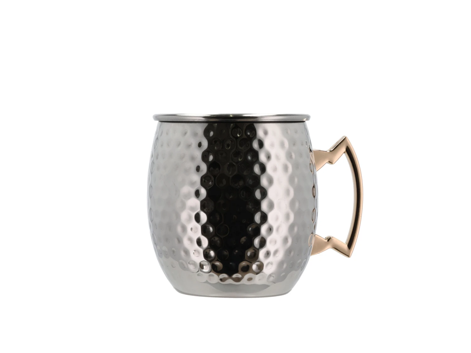 Der hübsche Krug mit Henkel und gehämmerter Außenseite ist der klassische und charakteristische Krug für den beliebten Cocktail Moscow Mule, der ein modernes Comeback feiert. Moscow Mule wird ganz einfach aus Ginger Beer, Wodka, Limettensaft und vielen Eiswürfeln gemixt, damit sich das Getränk eiskalt hält. Der Krug ist sehr leicht und fasst 0,5 Liter.
