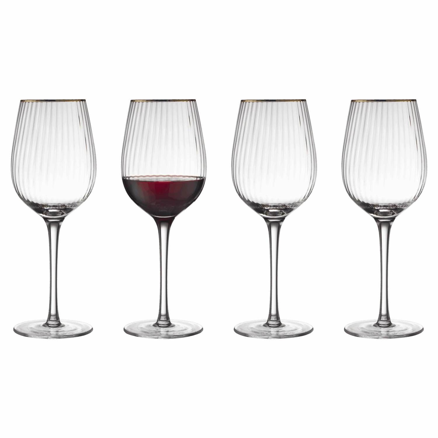 Hübsches Weinglas mit weichen, abgerundeten Formen. Das elegante, geriffelte Design mit hübscher Goldkante verleiht dem Glas einen tollen Vintage-Look, der gleichzeitig die Trends der Zeit widerspiegelt. Servieren Sie Ihren besten Wein in den Gläsern und die hübschen Facetten reflektieren das Licht und den Inhalt der Gläser auf wunderschöne Art und Weise.