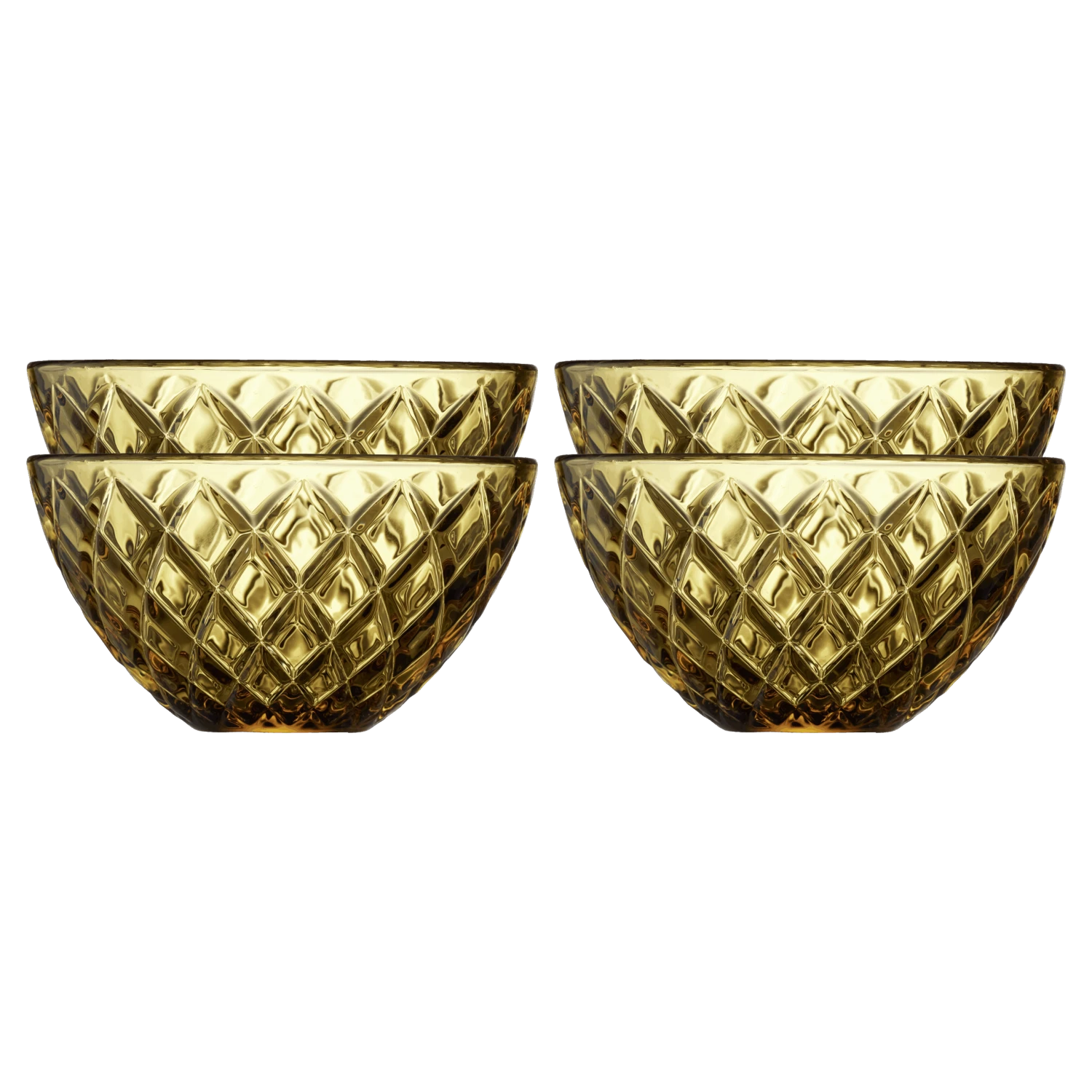 4 Schüsseln, Durchmesser 12 cm, aus farbigem Pressglas. Das klassische Design mit eleganten Facetten reflektiert das Licht und steigert das sinnliche Erlebnis, egal ob Sie knusprige Snacks, köstliche Dips oder portionierte Desserts servieren.