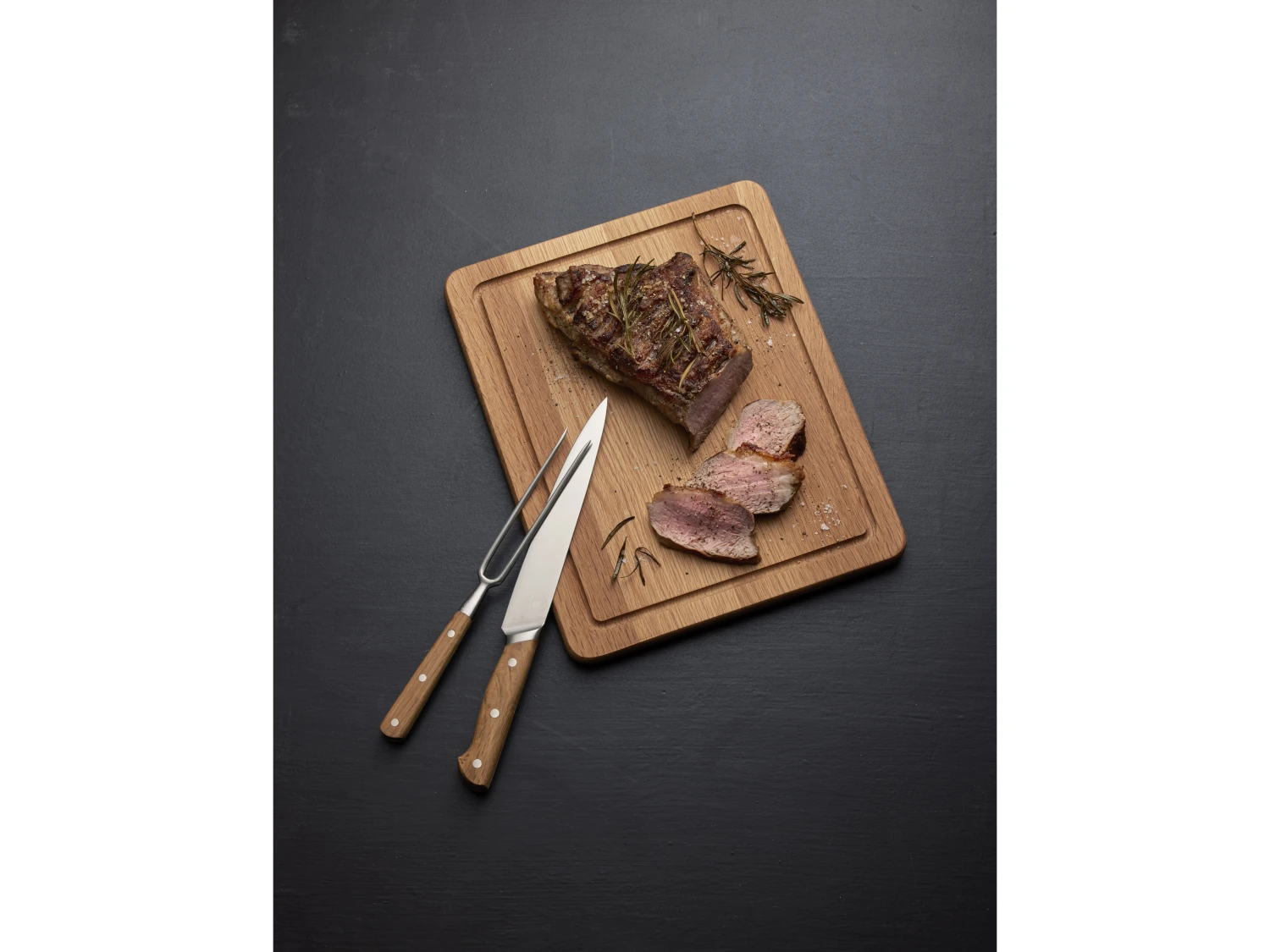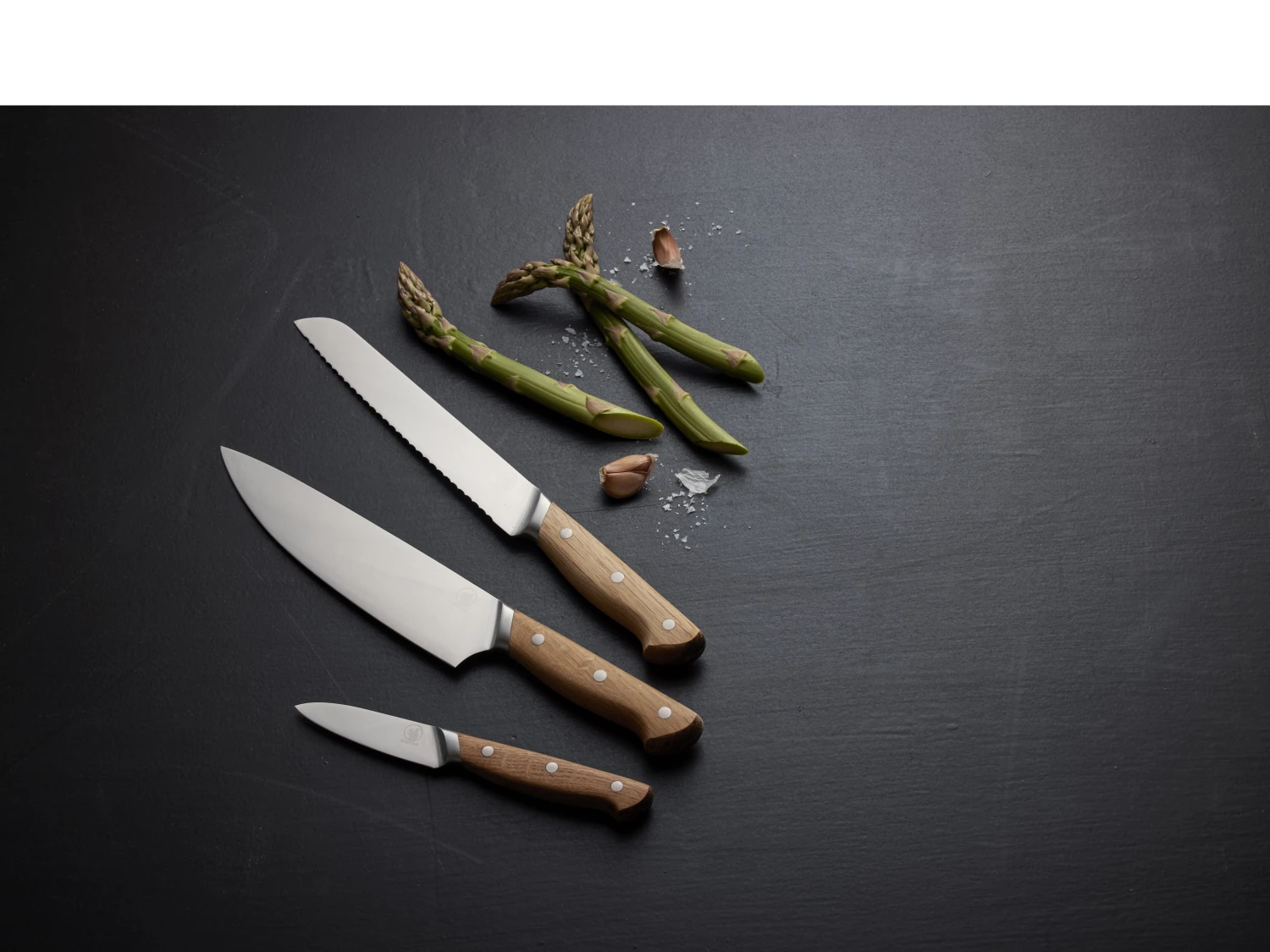 Die Messerklinge besteht aus hochwertigem Edelstahl und der Griff aus geölter Eiche, die bei Gebrauch Patina entwickelt und einfach schöner wird, je öfter das Messer verwendet wird. Der Holzgriff ist aus einem Stück Holz gefertigt und liegt angenehm in der Hand.