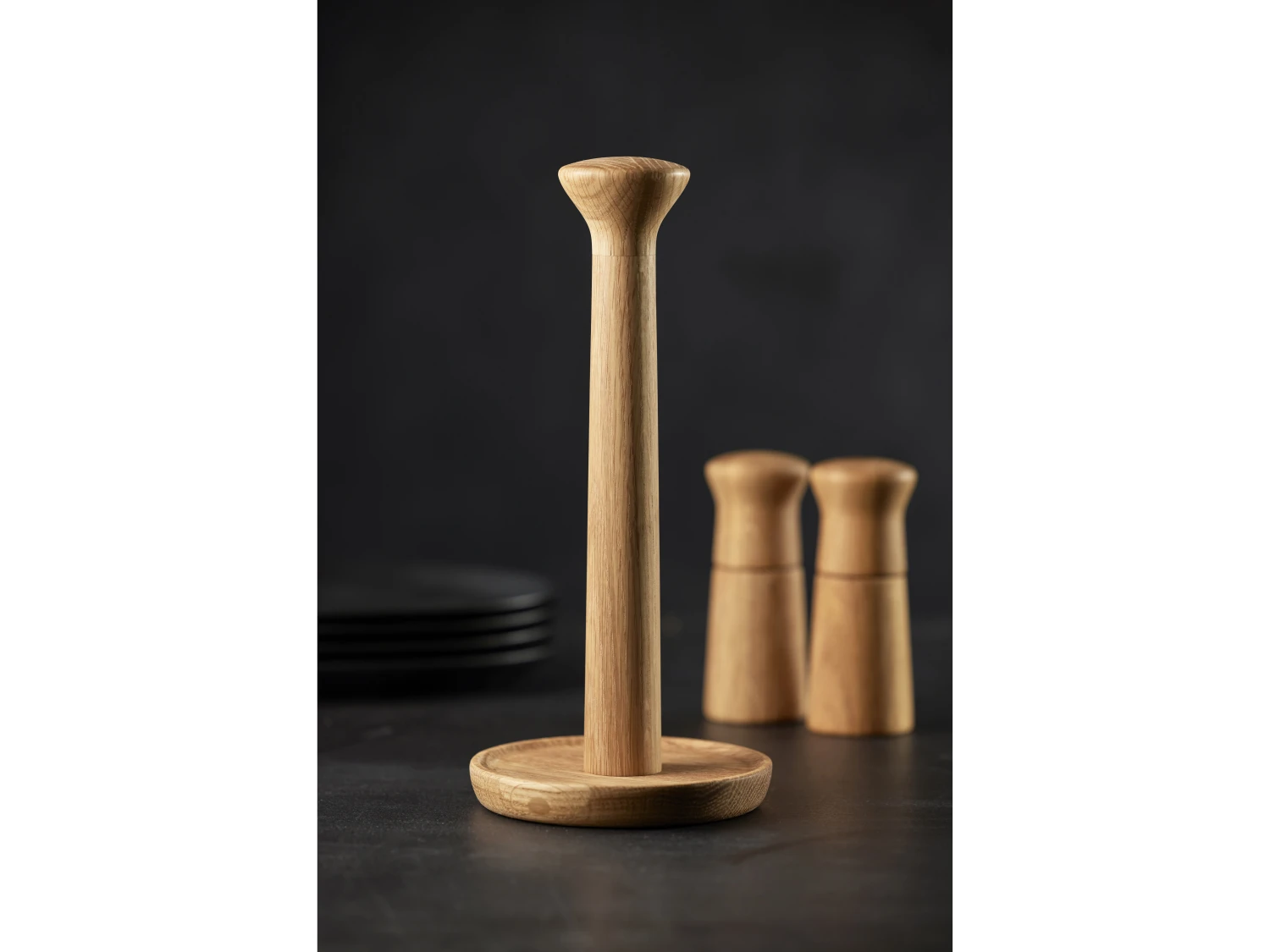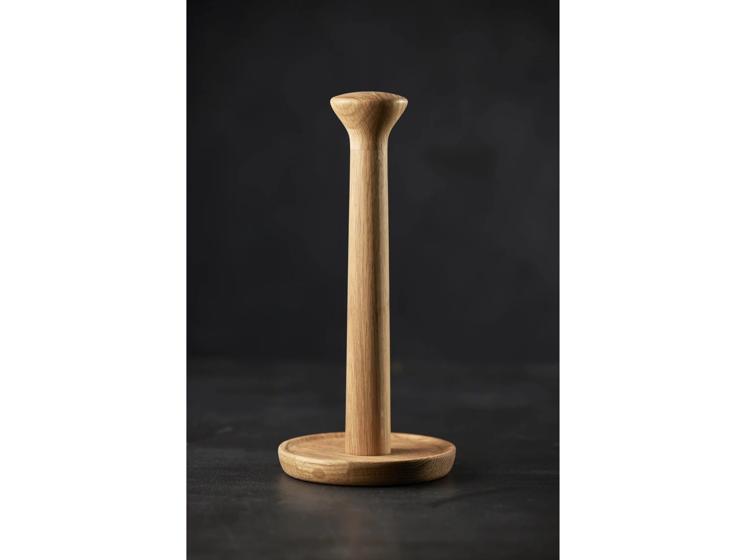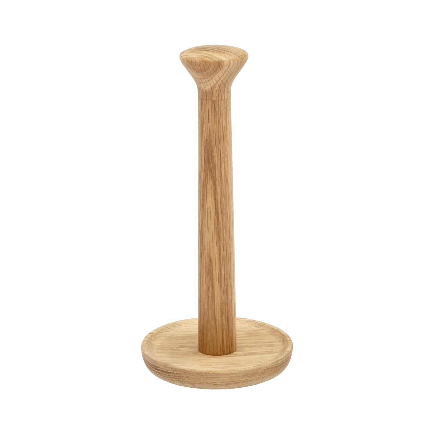 Rustikaler und solider Küchenrollenhalter mit Fuß und Halter aus gedrechselter, geölter Eiche. Ein funktioneller Magnet macht es einfach und schnell, die Küchenrolle auszutauschen. 30 cm x 14 cm im Durchmesser.