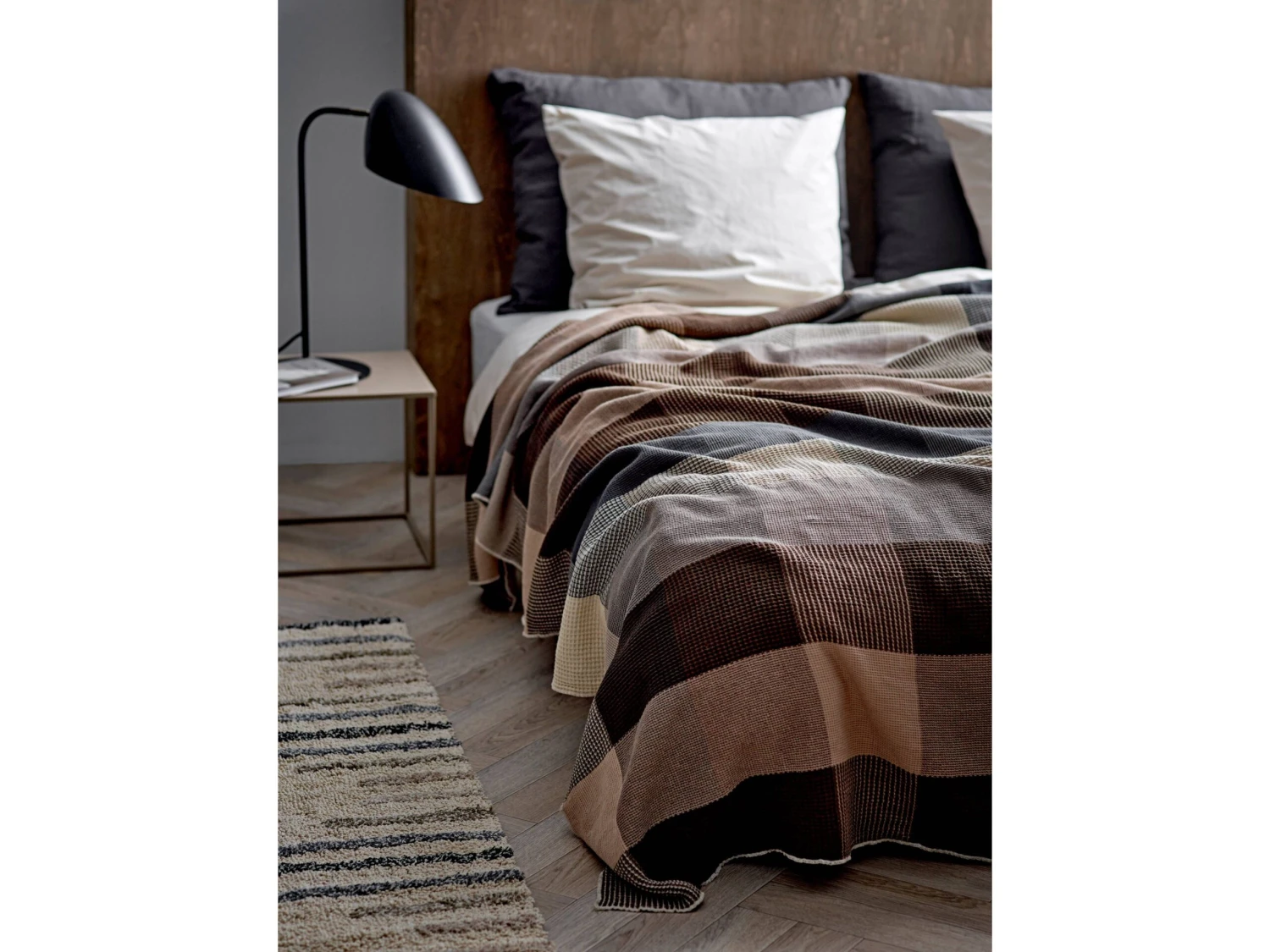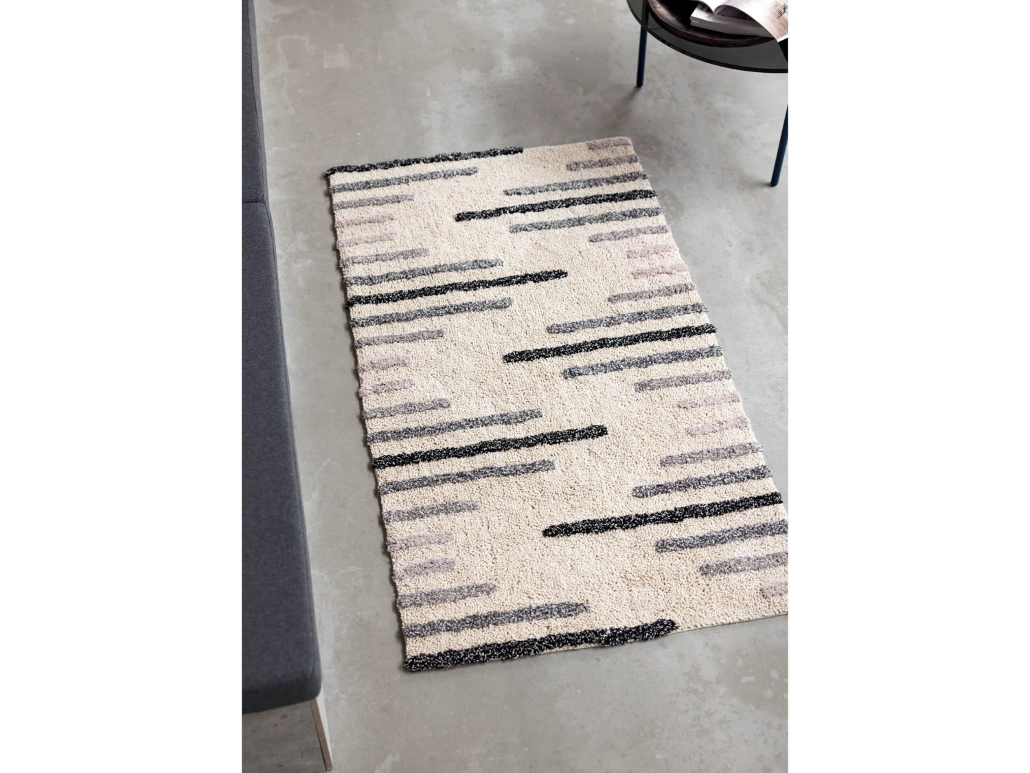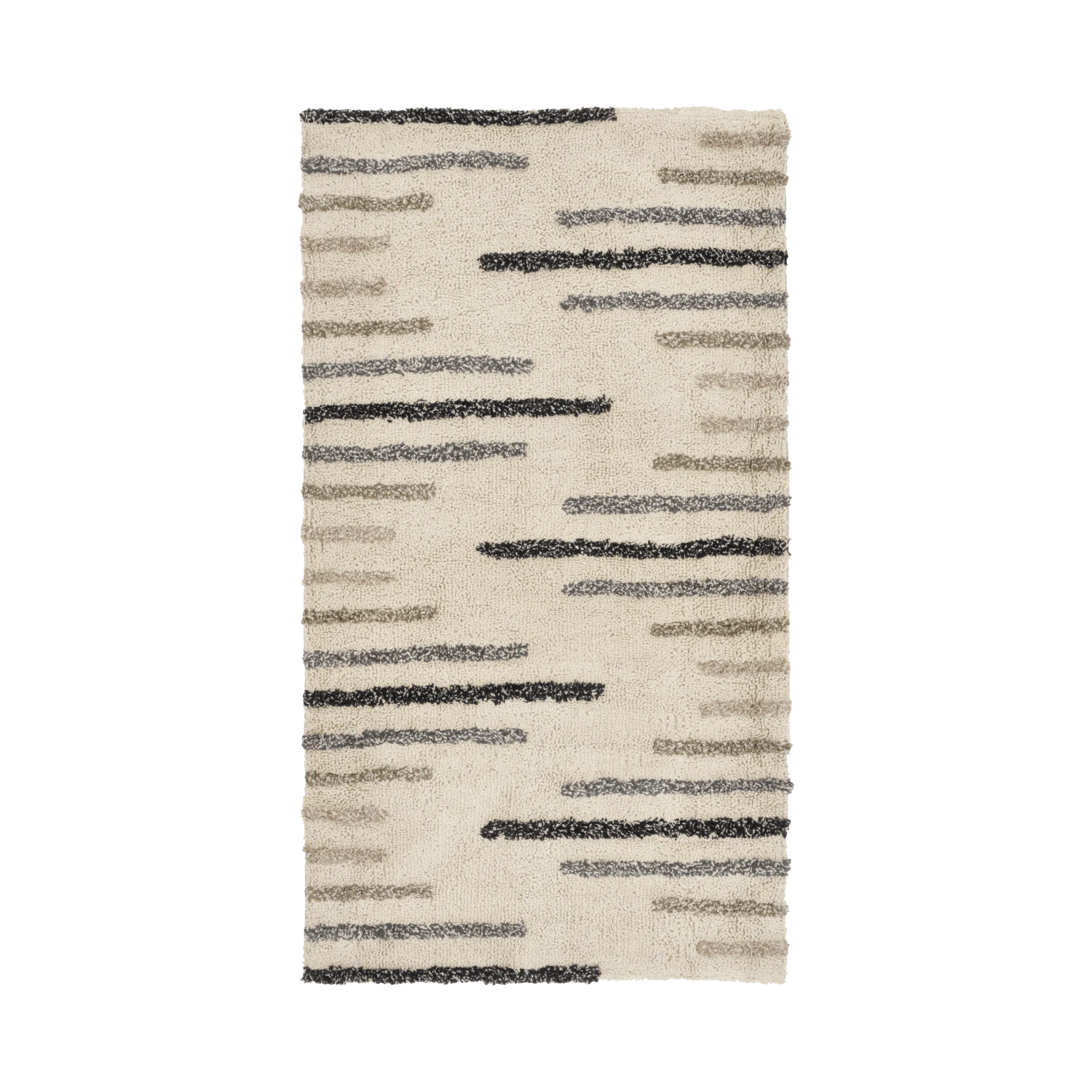 Der handgetuftete Tactile-Teppich mit einer schlichten Hochflor-Konstruktion ist der Schlüssel für einen weichen Look in der Wohnung. Denken Sie daran, gemütliche Textilien mit einer taktilen Oberfläche zu verwenden, um der Einrichtung eine multisensorische Note zu geben. Die matten Fasern und die subtilen Ecru- und Grautöne sorgen für eine raffinierte Gemütlichkeit, die unverzichtbar ist, wenn man die typisch skandinavische Ästhetik und den typisch skandinavischen Stil erzielen möchte.
