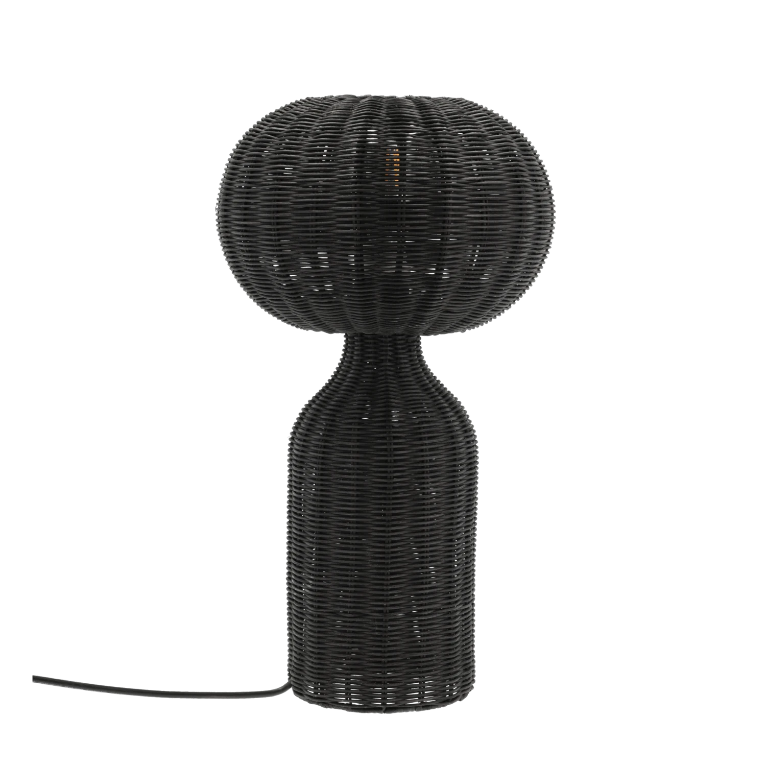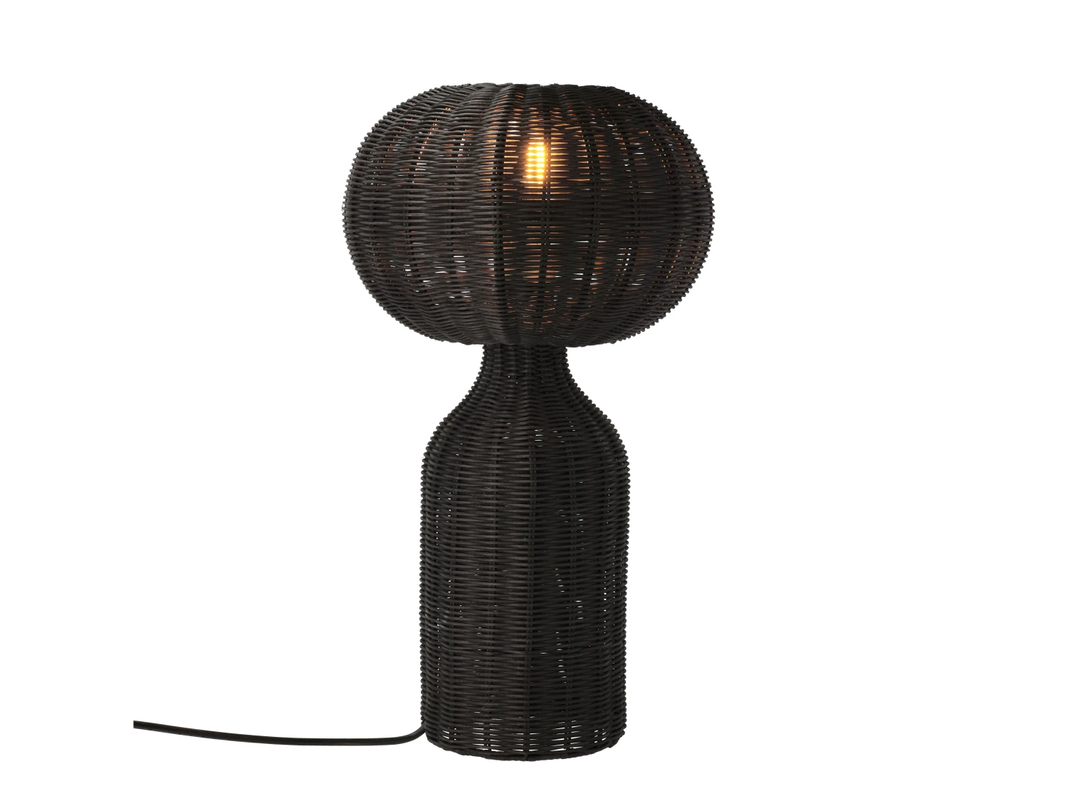 Tischlampe aus schwarzem Rattan. mit weichem und elegantem Licht. Ein tolles und warm leuchtendes Detail, das in jede kühle skandinavische Einrichtung passt. Mit 2 m langem schwarzem Polyesterkabel und E27 Fassung. D 30 x H 53,5 cm.
